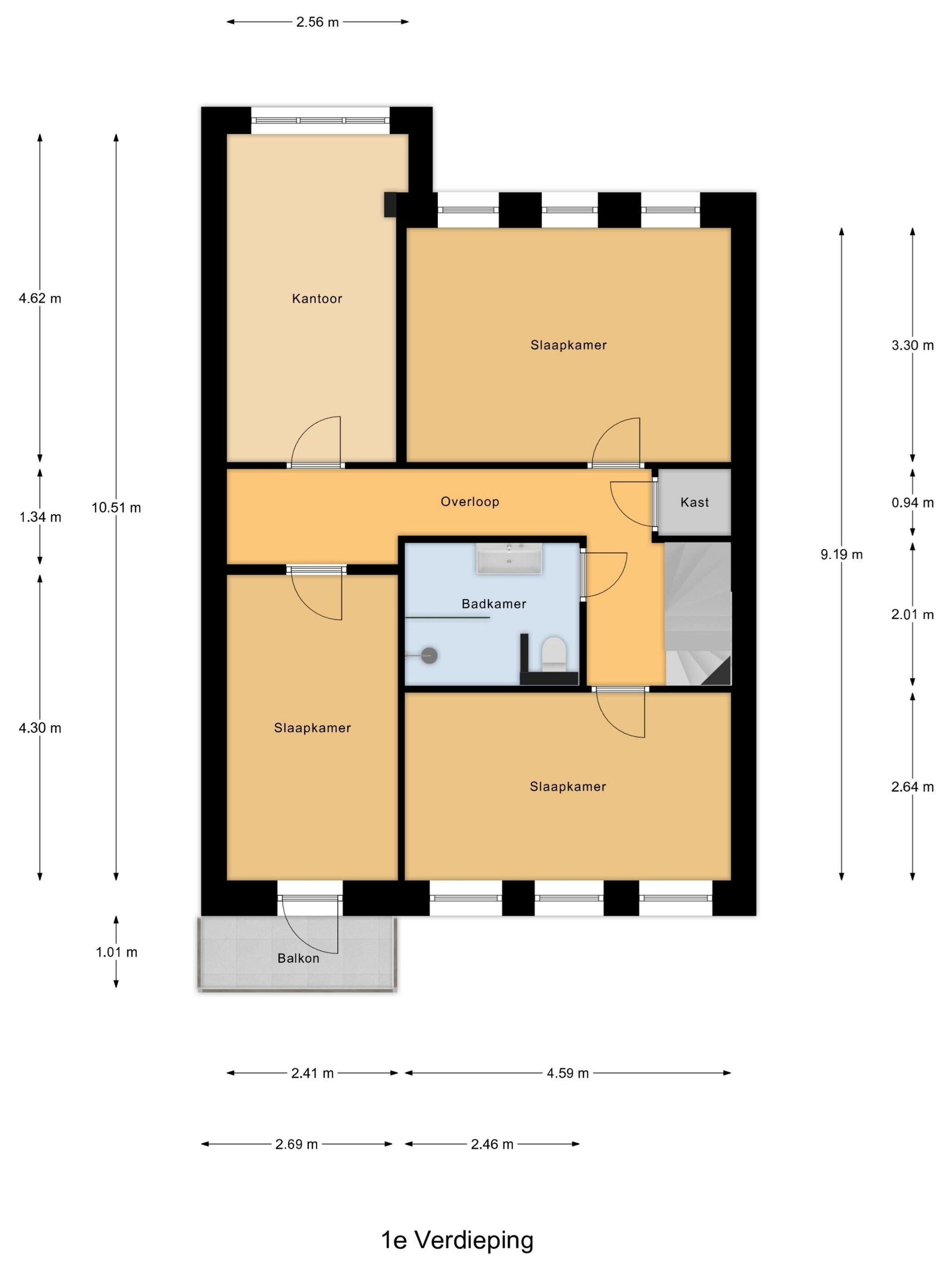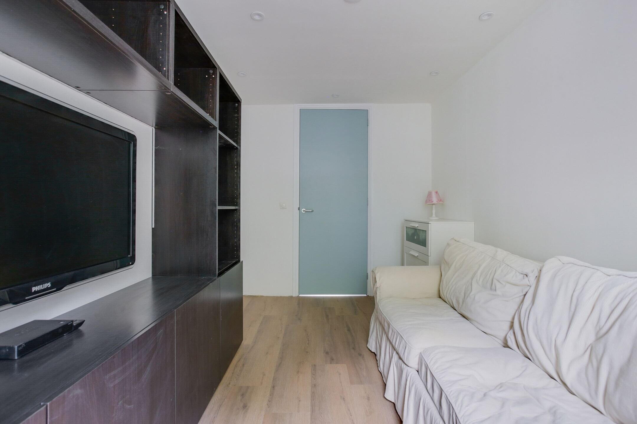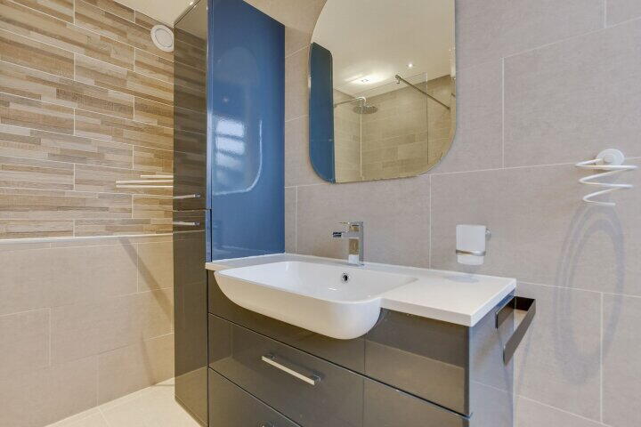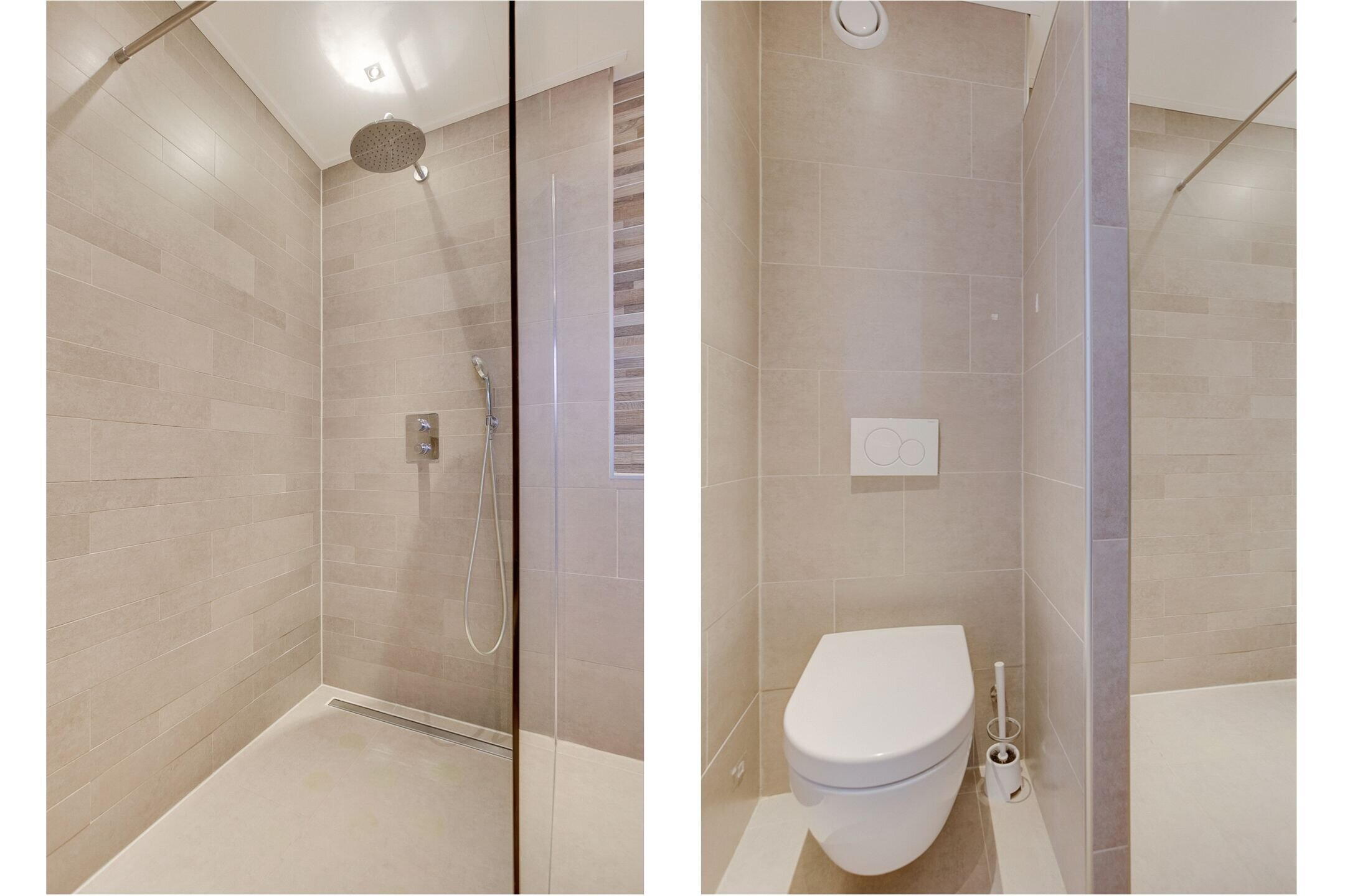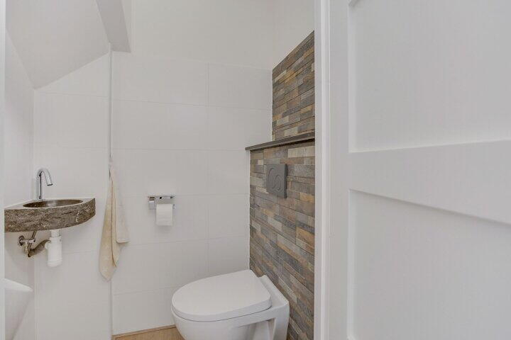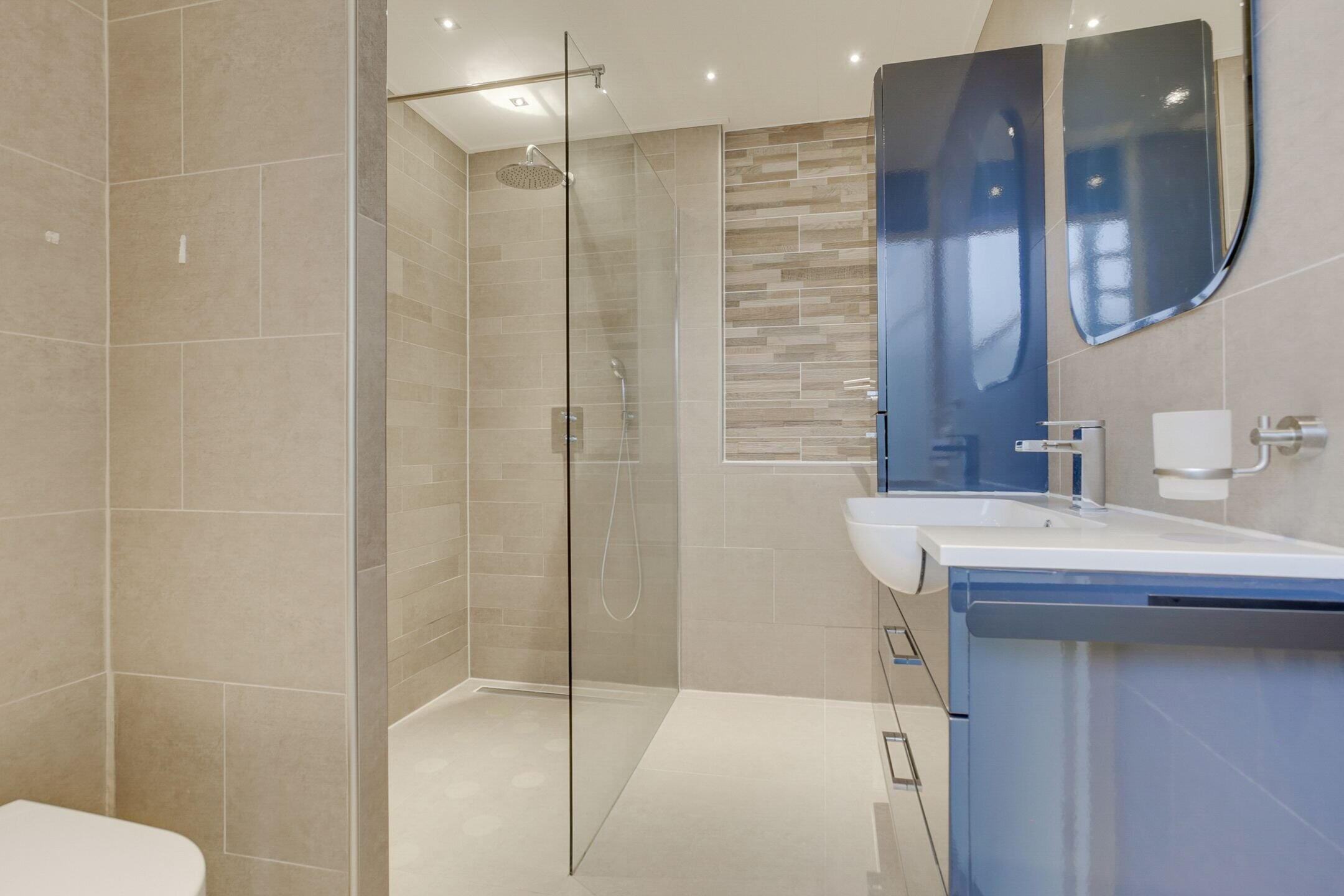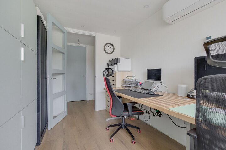 The first floor is exceptionally spacious thanks to the full-width and full-length extension, which also features underfloor heating. Here you'll find three large bedrooms with straight walls, a spacious office (which can also serve as an additional bedroom, making six in total), and a modern bathroom with a walk-in shower, second toilet, and vanity unit. The bathroom also has electric underfloor heating. One of the bedrooms has access to a balcony, giving it a unique charm.