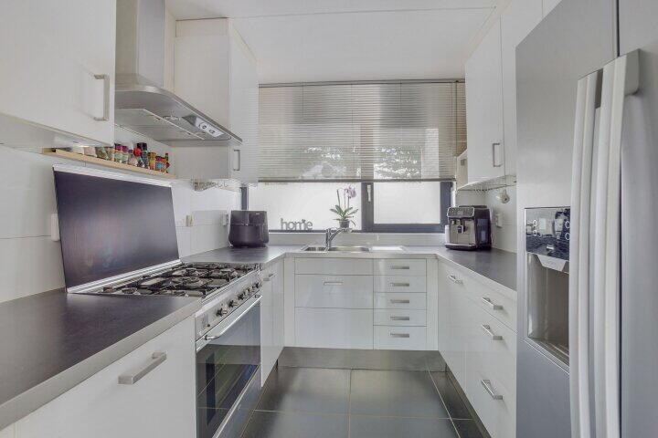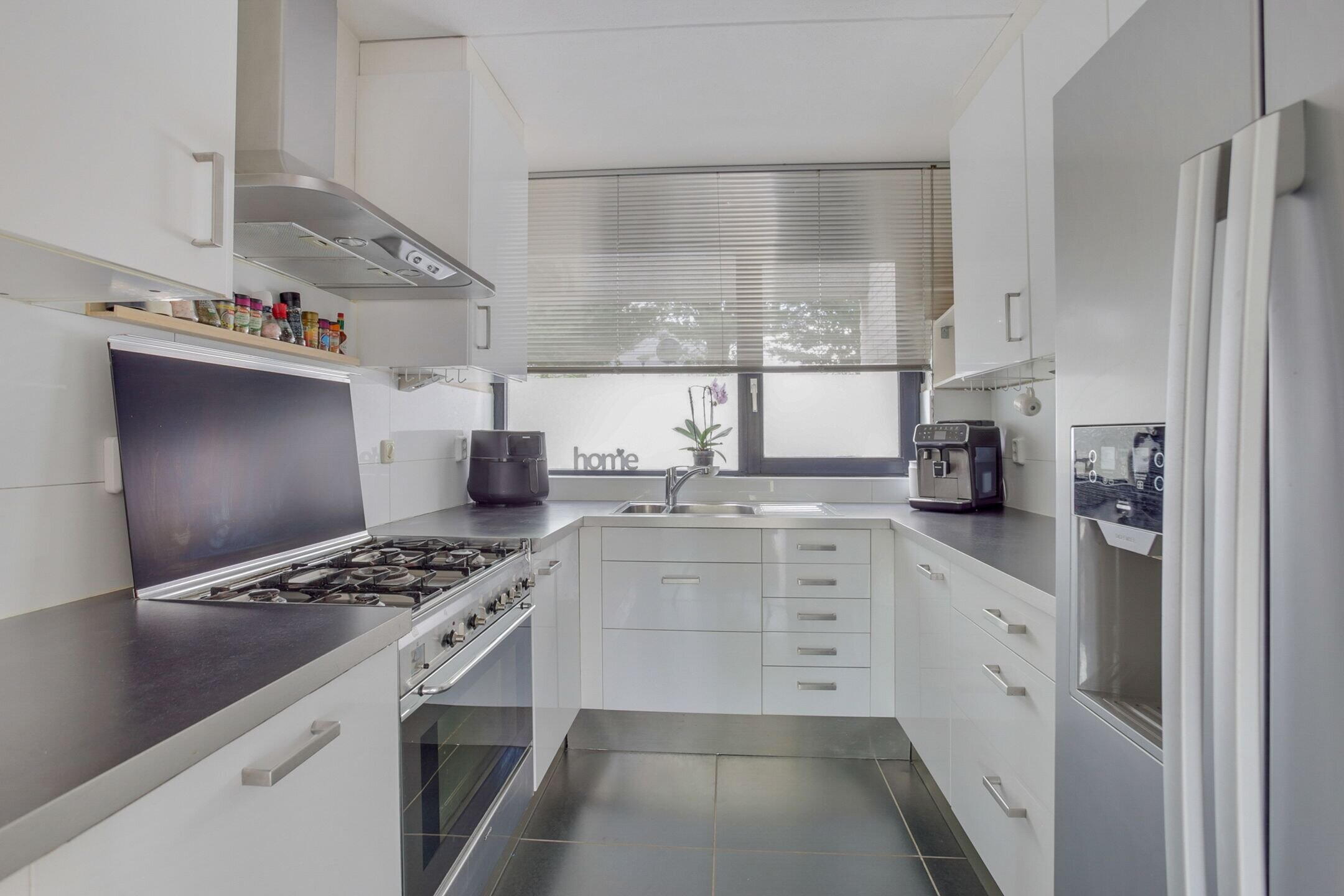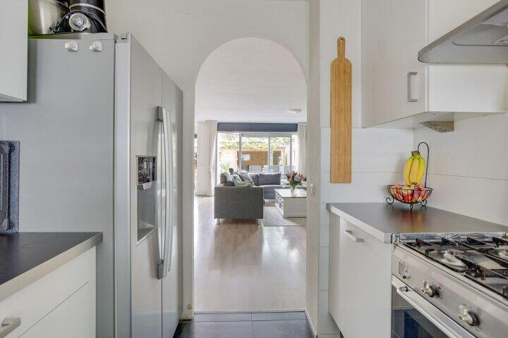 De keuken aan de voorzijde is uitgevoerd in een praktische U-opstelling en voorzien van diverse inbouwapparatuur, waaronder een gasfornuis, koel-vriescombinatie, afzuigkap en vaatwasser. Aansluitend vindt u de handige bijkeuken en de inpandige garage die voorzien is van een elektrische overheaddeur.
