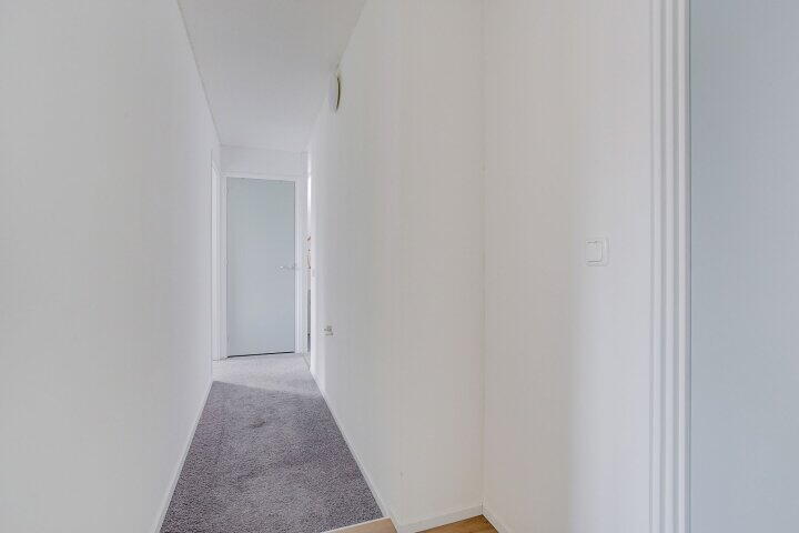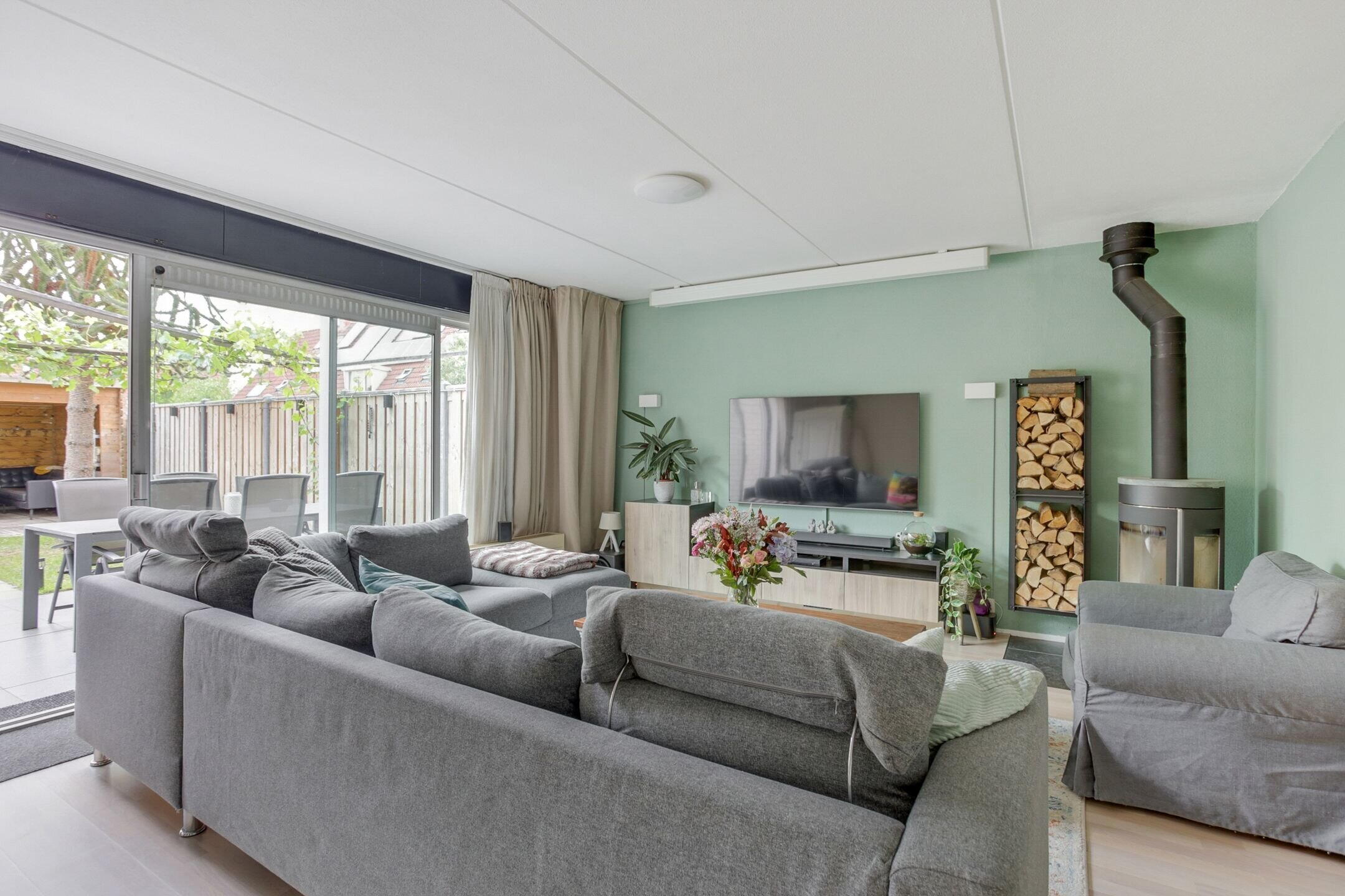 You enter via the tidy entrance hall, which includes a spacious toilet with urinal (renovated in 2024) and a meter cupboard. The bright and spacious living room features wide windows and sliding doors that provide beautiful natural light and views of the sunny garden. The cozy wood-burning stove completes the space.
